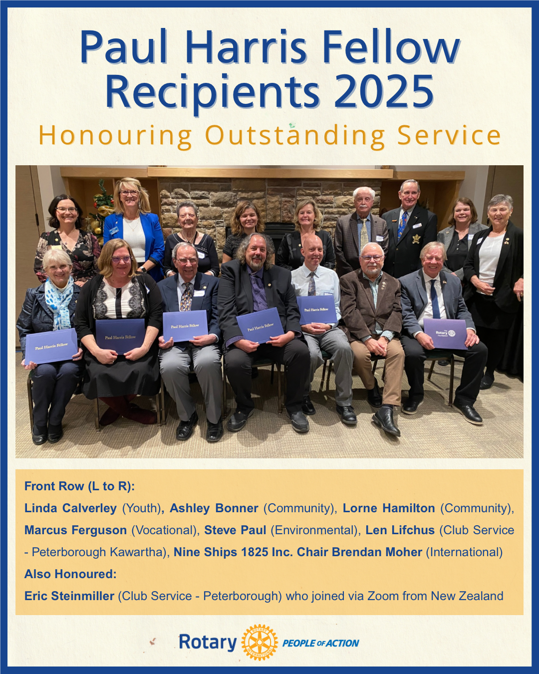 The Rotary Club of Peterborough and the Rotary Club of Peterborough Kawartha host an annual Paul Harris Fellow Recognition Dinner in November to recognize local individuals and Rotarians for their leadership and service contributions to our community, area and the world-at-large. This prestigious recognition is in honor of Paul Harris, the founder of Rotary International.